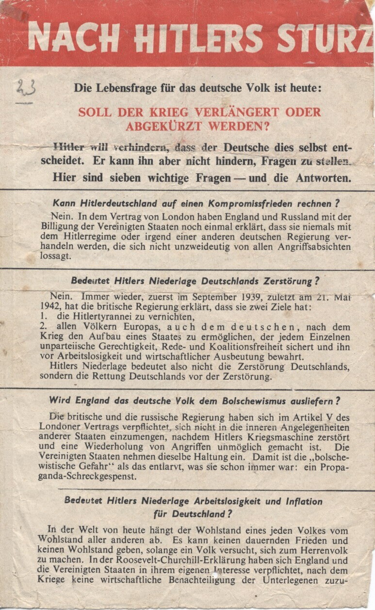 Geallieerd (Duitstalig) pamflet waarin antwoord wordt gegeven op een aantal vragen die betrekking hebben op wat de geallieerden van plan zijn met Duitsland als de oorlog voorbij is.
