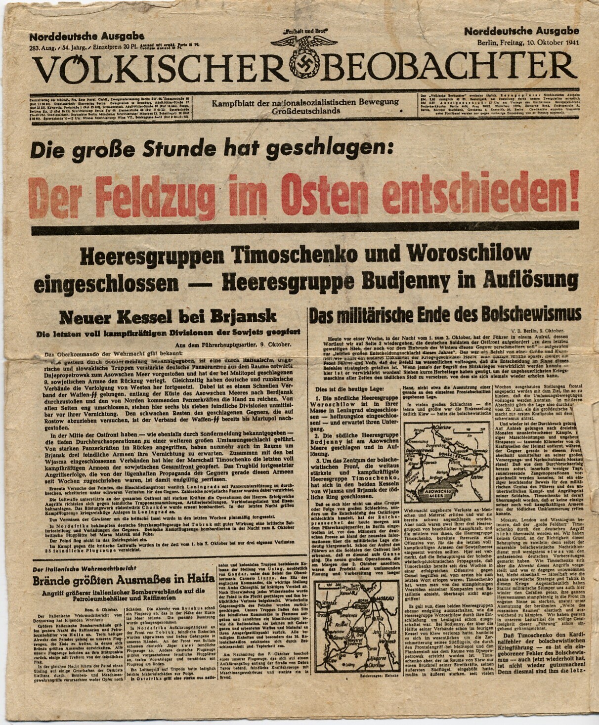 Exemplaar van de "Völkischer Beobachter" (Noord-Duitse uitgave) van 10 oktober 1941 over de veldtocht in het Oosten.