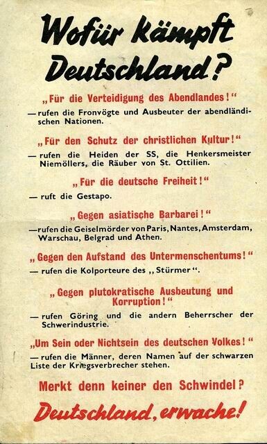 Geallieerd (Duitstalig) pamflet waarin het bedrog van de nazi's sinds de brand van de Rijksdag aan de kaak wordt gesteld. Duitsland wordt opgeroepen te ontwaken.