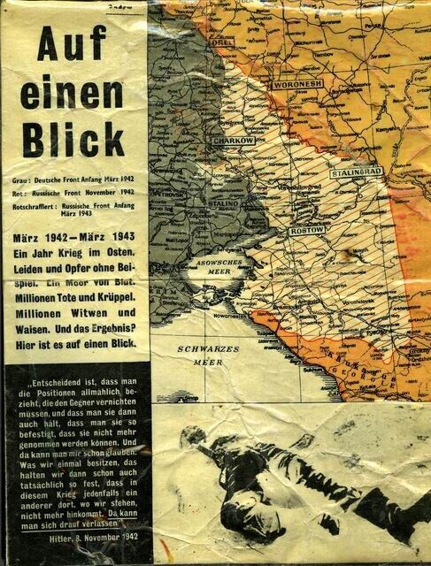 Geallieerd (Duitstalig) pamflet waarop de "resultaten" die de Duitsers van maart 1942 tot maart 1943 aan het Oostfront hebben bereikt door middel van een kaart zijn weergegeven. Aan de binnenzijde wordt door middel van foto's met onderschrift verslag gedaan van de Duitse nederlaag bij Stalingrad.<br>