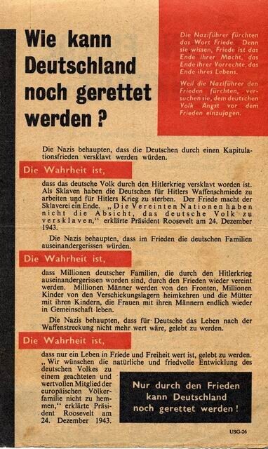 Geallieerd (Duitstalig) pamflet waarin gesteld wordt dat Duitsland alleen door middel van vrede de ondergang bespaard kan blijven.