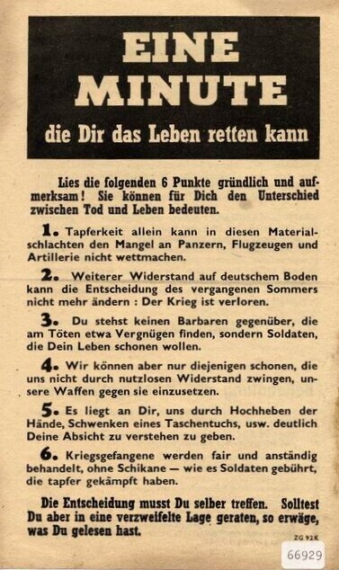 Geallieerd (Duitstalig) pamflet waarin Duitse soldaten worden geadviseerd om zich over te geven. Op de achterzijde wordt aangegeven op welke manieren men zich kan overgeven en wat de soldaten te wachten staat in een krijgsgevangenenkamp.