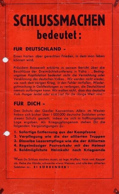 Twee exemplaren van een geallieerd (Duitstalig) pamflet waarin men de Duitse soldaten wijst op de gevolgen van voortzetting van de oorlog. Een zijde van het pamflet is rood gekleurd.