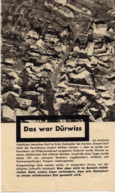 Geallieerd (Duitstalig) pamflet waarin de Duitsers worden opgeroepen de strijd te staken en op deze manier te voorkomen dat hun steden met de grond gelijk worden gemaakt. Op de achterzijde een luchtfoto van het verwoeste Duitse dorp Dürwiss.