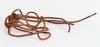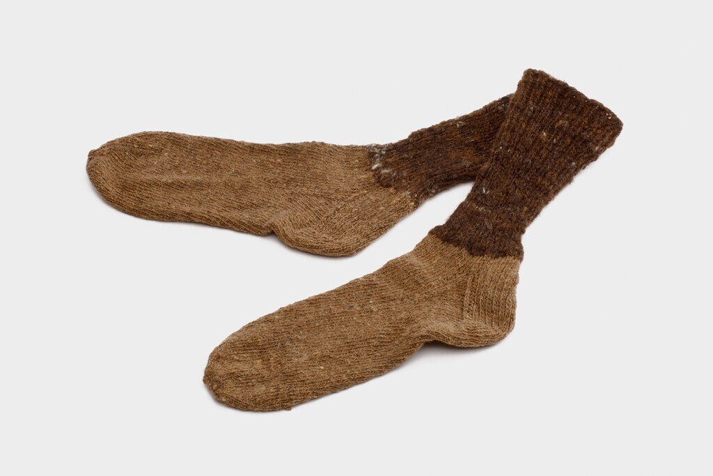 Een paar bruine ruw wollen sokken gebreid van bijeengesprokkelde wol die aan de prikkeldraadomheiningen van de weiden rond Scherpenzeel was blijven hangen. Deze wol werd door mevrouw A C. Bijleveld gesponnen. De voet is gebreid van tweeddraad en daardoor stugger.