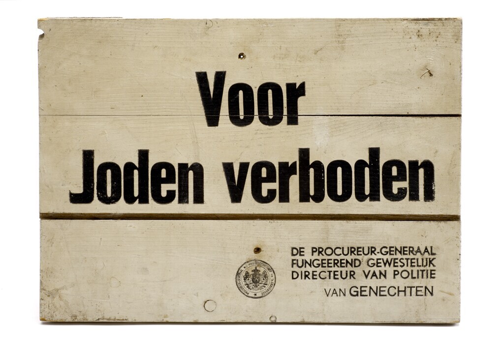 Een wit geverfd houten bord met daarop in zwart: "Voor Joden verboden". Rechtsonder: "De procureur-generaal fungeerend gewestelijk directeur van politie Van Genechten" met links daarvan het ronde stempel van de procureur-generaal te Den Haag.