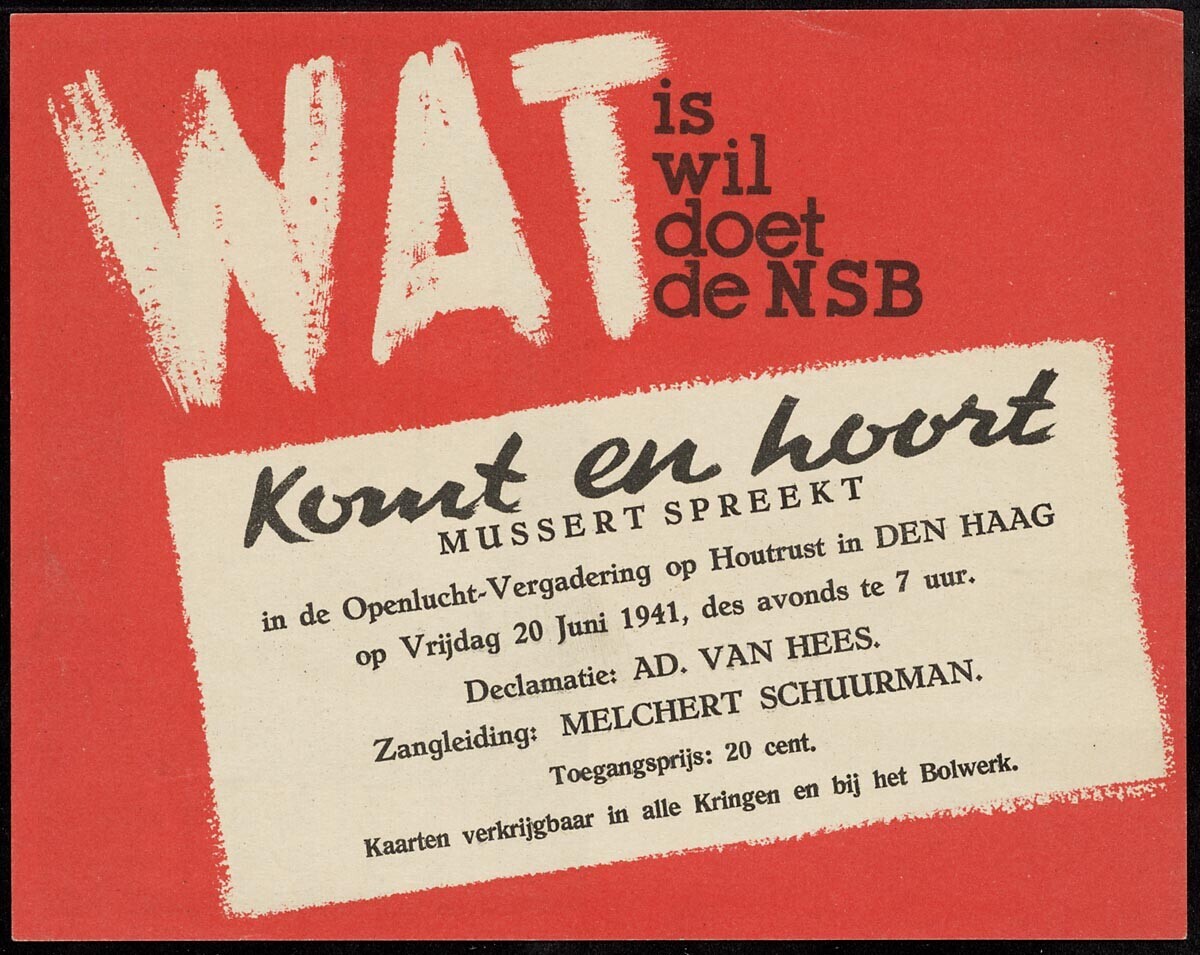 Een pamflet met een uitnodiging voor een 'Openlucht-Vergadering op Houtrust in Den Haag' van de NSB. Op de achterkant een lijst met 'Nationaal-Socialistische lectuur' en een afdruk van een affiche: "Met Mussert: Hou-zee".