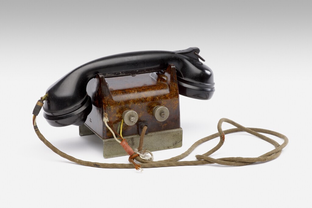 Veldtelefoon uitgevoerd als een klein kastje van gemarmerd bakeliet waarop de zwarte hoorn rust deze heeft een uitschakelknop. Voorop twee draaiknoppen.Het geheel rust op een metalen brug.