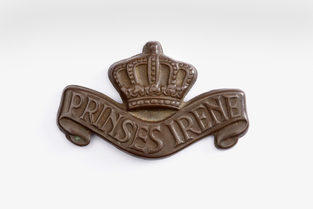 Een bronskleurige metalen schouderembleem van het Garderegiment Fuseliers Prinses Irene de opvolger van de de Prinses Irene Brigade (1941-1945) dat betrokken was bij de bevrijding van Nederland.