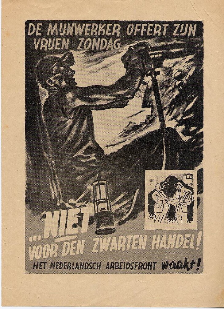 Affiche van het arbeidsfront gericht tegen de zwarte handel. Op de affiche is een mijnwerker afgebeeld.