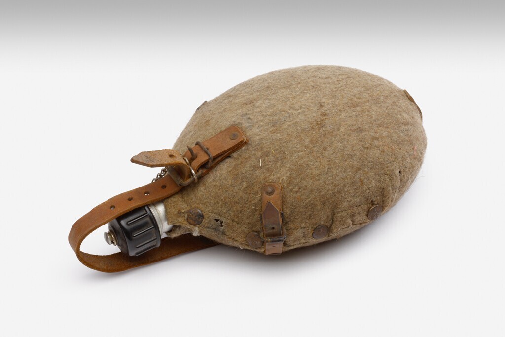 Een Duitse militaire metalen veldfles met bruin vilt overtrokken. Over de dop hoort een groene metalen mok die met de wel aanwezige leren riempjes aan de veldfles wordt vastgemaakt. Aan de leren riempjes een haak om de veldfles met mok vast te maken rechtsachter aan de koppel op de broodzak behorend tot de militaire uitrusting.