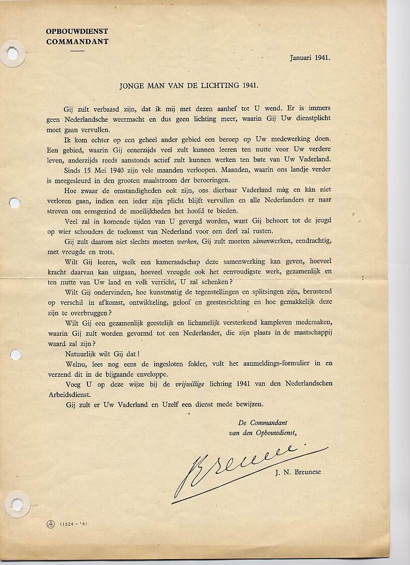 Circulaire bij een folder van de 'Opbouwdienst’ waarin jonge mannen gestimuleerd worden zich op te geven als vrijwilliger voor de arbeidsdienst.