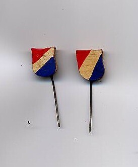 Twee zelfgemaakte speldjes in de vorm van een houten schildje met diagonaal de kleuren van de Nederl...