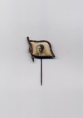 Een zilverkleurig metalen speldje in de vorm van een vlag met daarin een zwartwit foto met het portret van Koningin Wilhelmina.