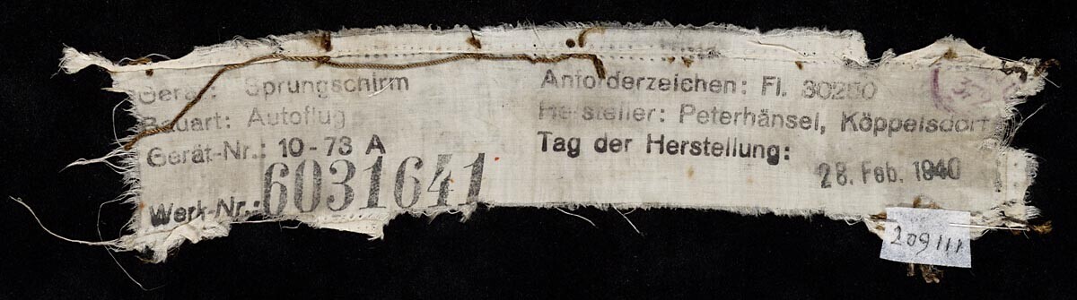 Smalle strook afkomstig van een Duitse parachute met onder andere de fabricagedatum vermeld: 28 februari 1940. Toegevoegd is en Duitse ansichtkaart met een zwart-witfoto van een parachutist.