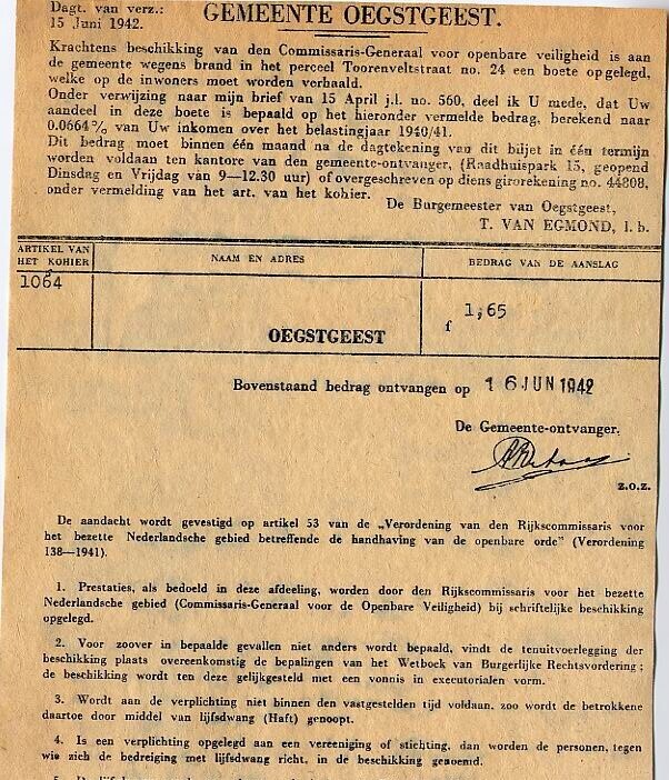 Getypte kwitantie uitgegeven door de gemeente Oegstgeest op 15 juni 1942 van een boete ad. F 1,65, die de gemeente Oegstgeest op de inwoners verhaalt na een brand. Bij niet voldoen van de betaling wordt 'lijfsdwang (Haft)' uitgevoerd door de Duitse politie. Een stempel voor ontvangst op 16 juni 1942.