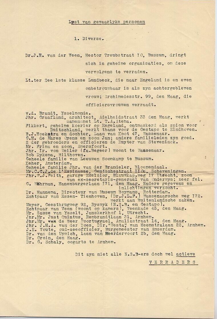 Twee lijsten van gevaarlijke personen en verkeerde officieren die niet allemaal N.S.B-er zijn maar wel ''actieve verraders.''