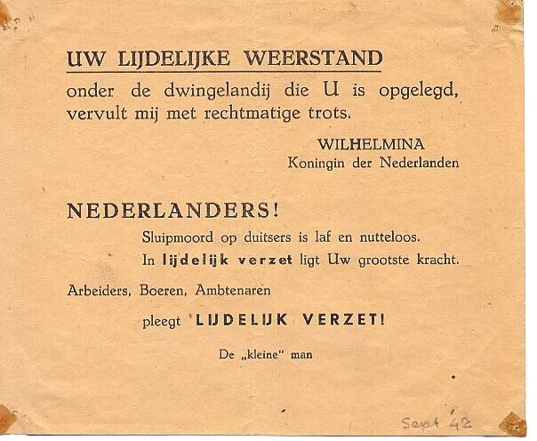 Een pamflet met de oproep tot lijdelijk verzet, ondertekend met 'De "kleine" man'.