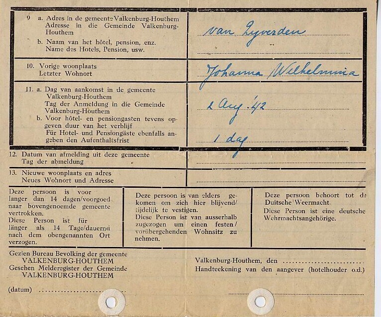 Een in het Duits en Nederlands gesteld, voorgedrukt registratieformulier voor het verblijf in de gemeente Valkenburg. In pen is de naam van Johanna Wilhelmina van Zijverden geschreven met de aankomstdatum in de gemeente Valkenburg-Houthem op 2 augustus 1942 en de verblijfsduur van 1 dag.<br>