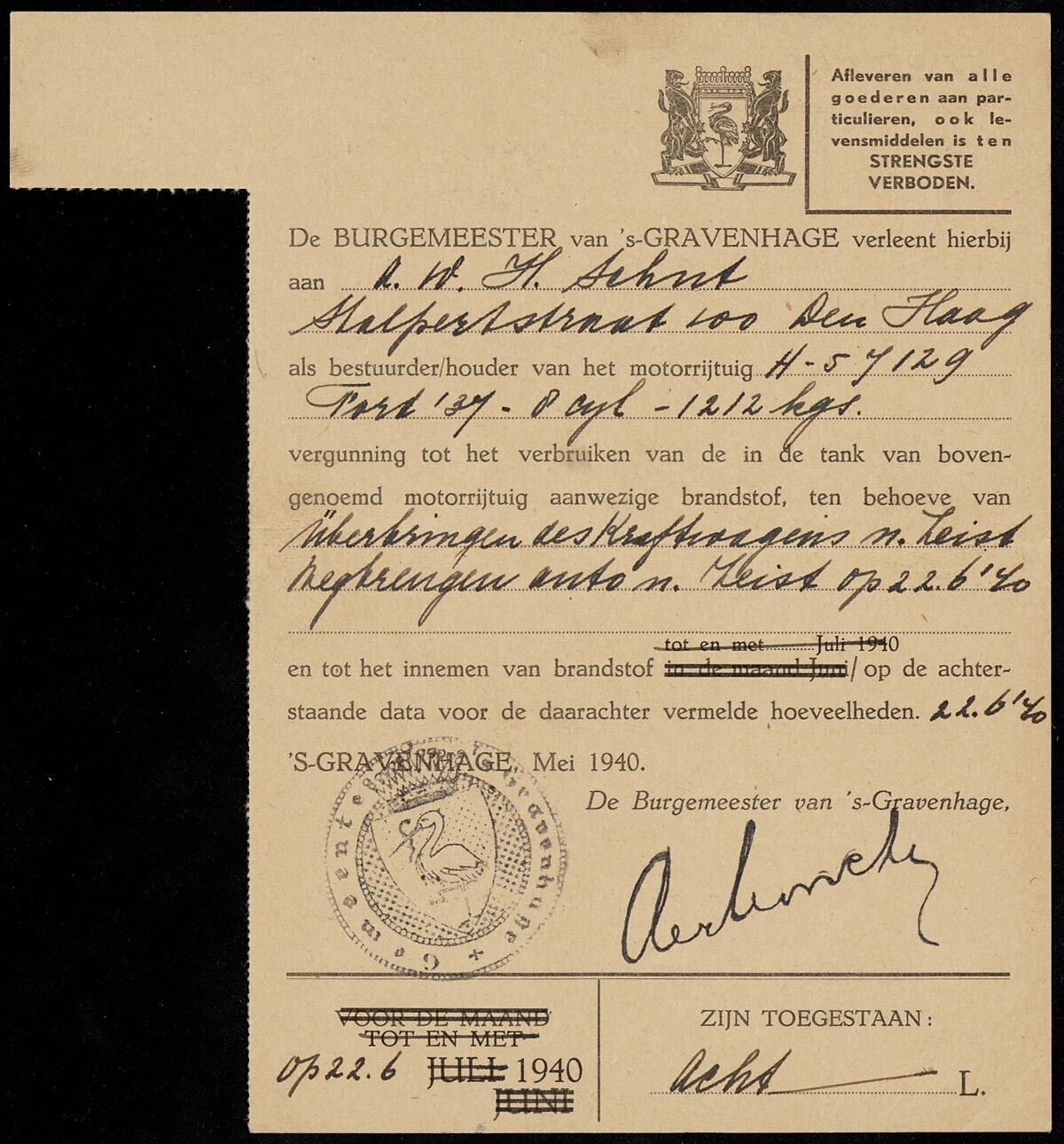 Een vergunning afgegeven door de gemeente Den Haag oor het tanken van voldoende benzine voor het rijden van een vrachtwagen van Den Haag naar Zeist en terug op 22 juni 1940. Het formulier is voorgedrukt in het Nederlands met de datum mei 1940. Het is met pen in het Duits ingevuld en gedateerd: 22.6'40 voorzien. Op de achterkant: de aftekening van de pomphouder en de datum 22/6/'40. De controle strook is verwijderd.