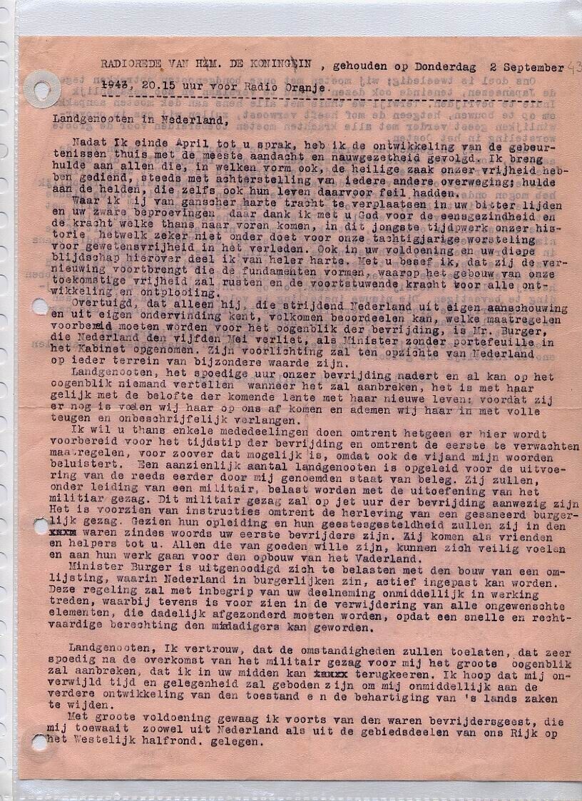 Roze gekleurd stencil met de tekst van een radiorede van Koningin Wilhelmina "gehouden op Donderdag 2 september 1943, 20.15 uur voor Radio Oranje."
