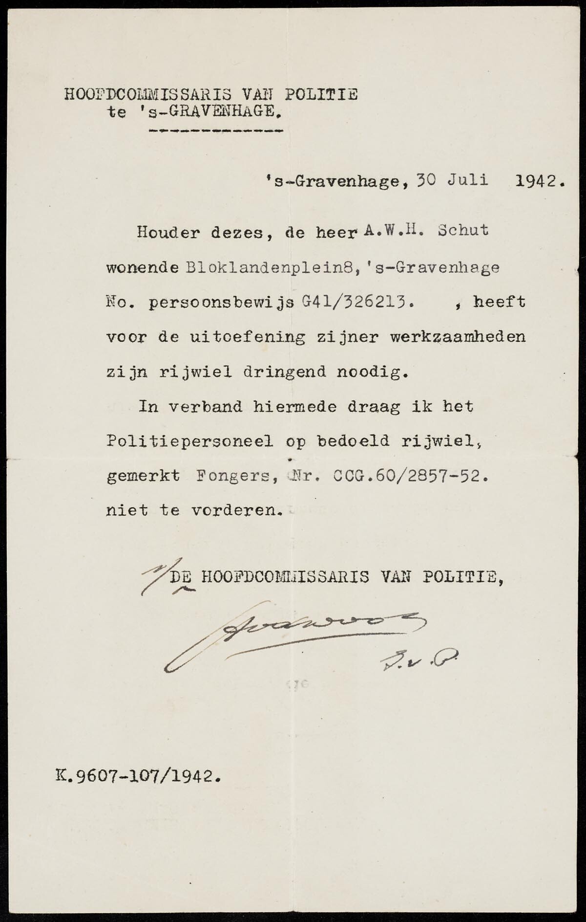 Getypte verklaring verstrekt door "De hoofdcommissaris van politie te 's-Gravenhage" op 30 juli 1942 aan de heer A.W.H. Schut. Hierin wordt verklaard, dat genoemde zijn rijwiel voor de uitoefening van zijn werkzaamheden dringend nodig heeft, waardoor dit niet mag worden gevorderd.