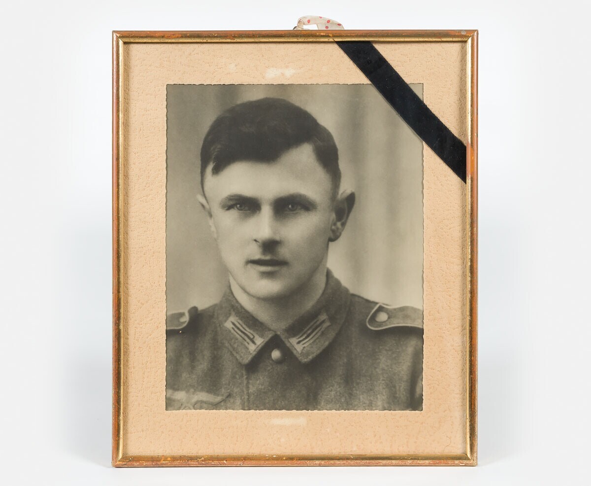Een portretfoto van een jonge militair in het uniform van de Duitse Wehrmacht gevat in een goudkleurige lijst met over de rechter bovenhoek een rouwband.