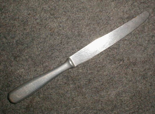 Tafelmes vervaardigd in Solingen met op de onderzijde van het heft het embleem van de Nederlandse Arbeidsdienst (N.A.D.).