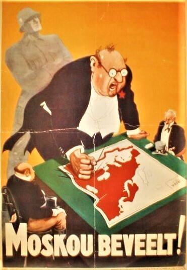 Nationaalsocialistische affiche met de afbeelding van drie heren in avondkleding rond een tafel met daarop de kaart van Europa. De personen die Engeland en de Verenigde Staten symboliseren zijn zittend en klein afgebeeld. De persoon die de Sovjet-Unie symboliseert is groot, staand en met de vuist slaand op de kaart afgebeeld met achter hem de schim van een militair. Onderaan: "Moskou beveelt!"