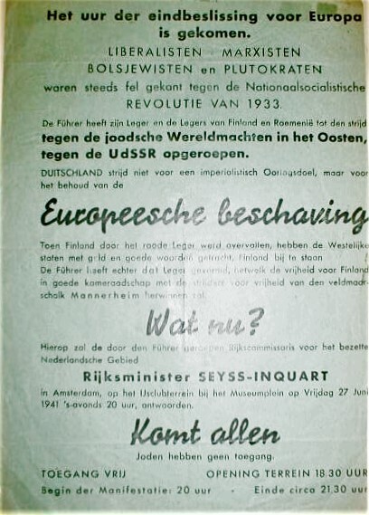Affiche waarop bekend wordt gemaakt dat Rijkscommissaris Seyss-Inquart een toespraak zal houden over de Duitse aanval op de Sovjet Unie. Deze toespraak zal op vrijdag 27 juni 1941 plaatsvinden op het IJsclubterrein bij het Amsterdamse Museumplein.