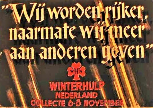 Een affiche met rode, witte en gele opdruk tegen een bruine achtergrond van de Winterhulp Nederland met een oproep te doneren tijdens de collecte van 6 tot 8 november.