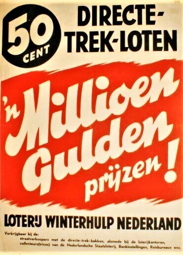 Een affiche met rode en zwarte opdruk op een witte ondergrond van de Winterhulp Nederland met een oproep om aan hun loterij deel te nemen.