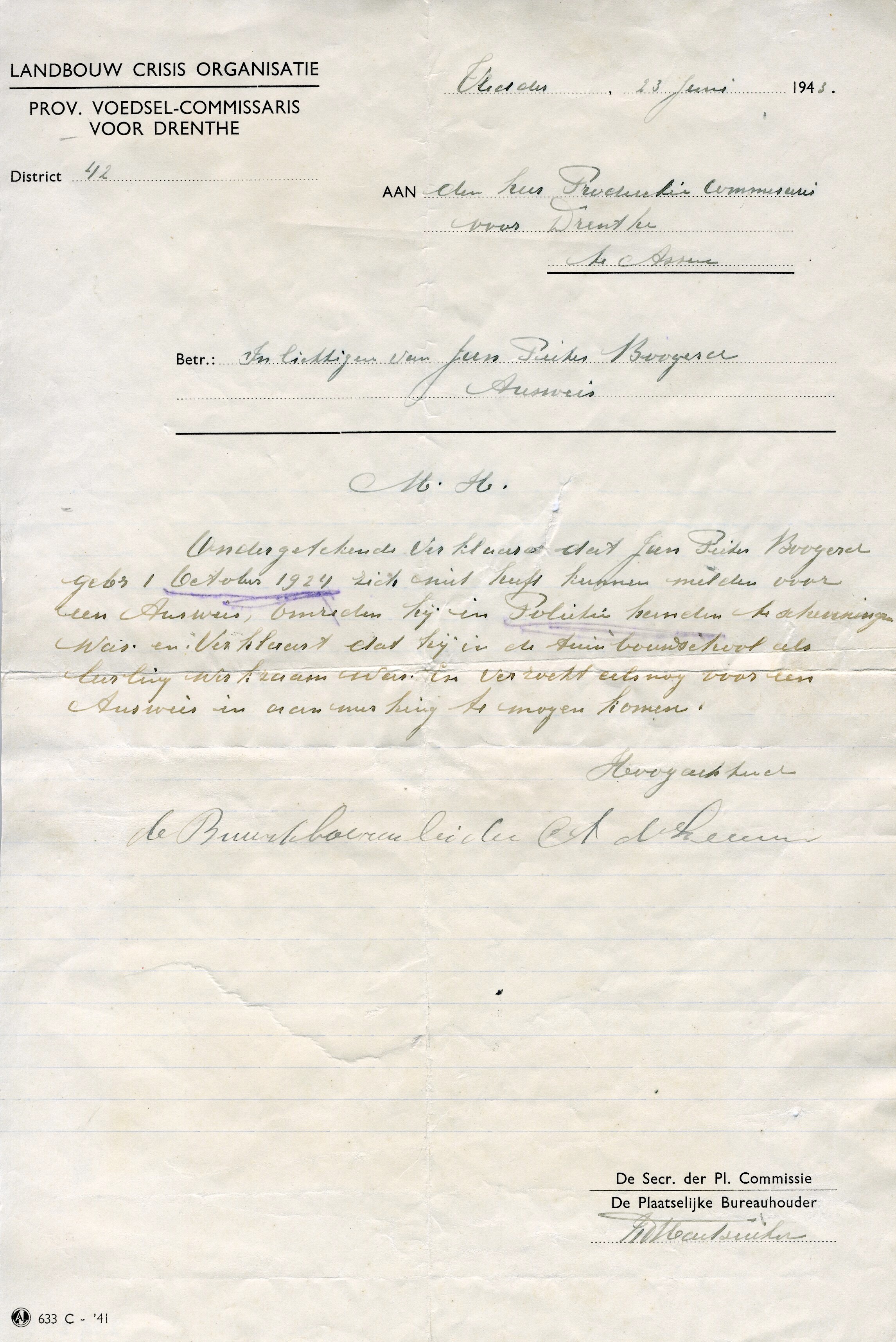 Brief aan J.P. Boogerd van de Provinciale Voedsel-Commissaris voor Drenthe waarin verklaard wordt dat de heer Boogerd zich niet kon melden voor een Ausweis omdat hij in "Politie handen" was te Scheveningen en alsnog verzoekt een Auswijs te mogen krijgen.