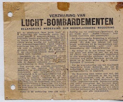 Pamflet aan de Nederlandse burgers betreffende geallieerde bombardementen. Afkomstig van de Nederlandse regering en het Geallieerd opperbevel.