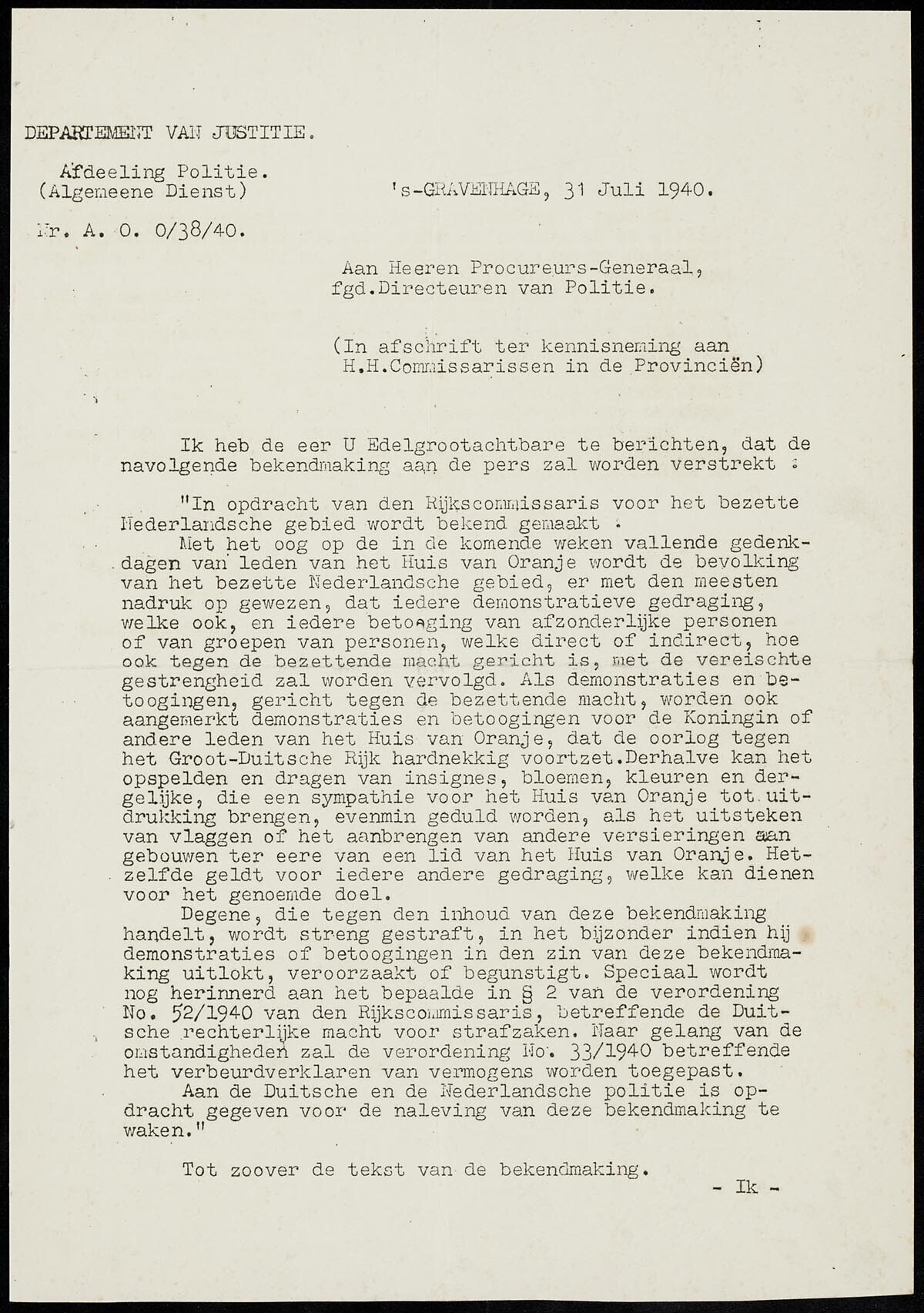 Een getypte brief van het "Departement van Justitie, met onder andere de tekst van een persbericht, waarin iedere provocatie op de gedenkdagen van leden van het Koninklijk Huis moet worden vervolgd. Ondertekend door "De Secretaris-Generaal, wnd. Hoofd van het Departement van Justitie, (J.C. Tenkink)".