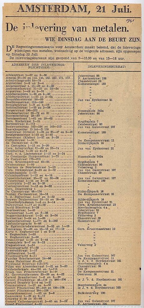Krantenknipsel met een lijst van "Adressen der inleveringsplichtigen" en van inleveringsbureau ‘s voor het inleveren van metalen.