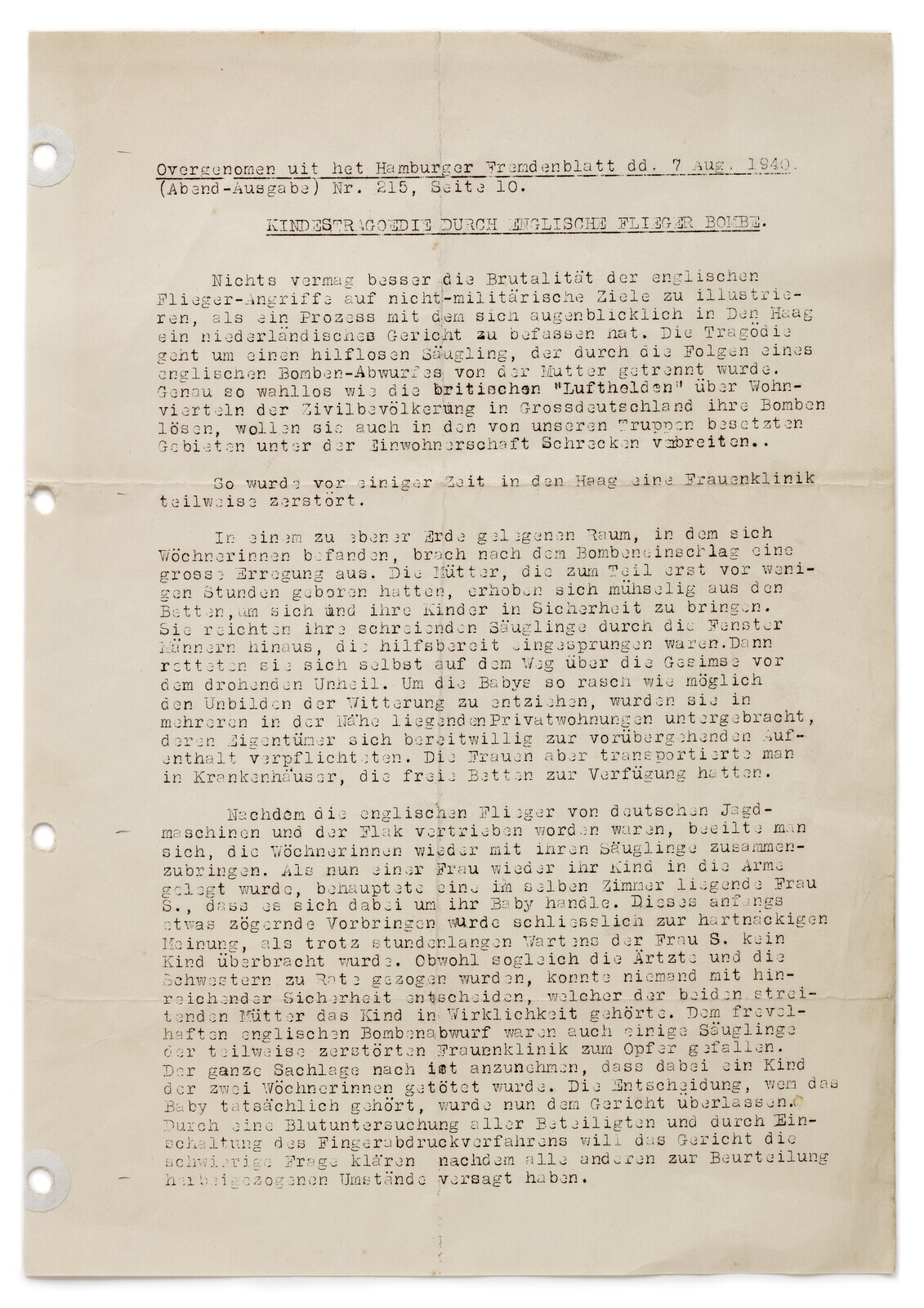 Gestencild bericht met tekst uit het Hamburger Fremdenblatt van 7 augustus 1940 over een Brits bombardement in Den Haag waarbij kinderslachtoffers vielen.