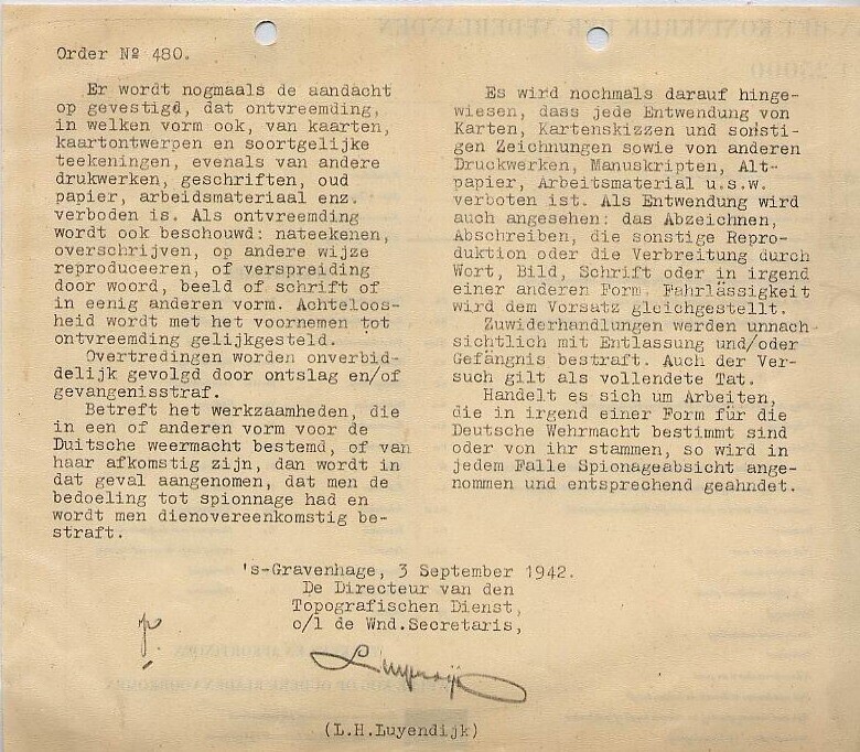 Bericht van de directie van de Topografische dienst, getypt aan de achterzijde van een gedeelte van een stafkaart, waarin gewaarschuwd wordt tegen de ontvreemding of het overtekenen en verspreiden van kaarten, tekeningen etc. van de dienst. De tekst is in het Nederlands en het Duits.