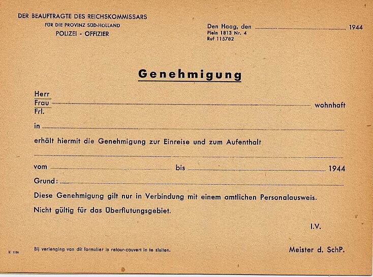 Twee oningevulde Duitstalige formulieren voor het verkrijgen van een reis-en verblijfsvergunning. Deze is echter niet geldig voor de onder water gezette gebieden.