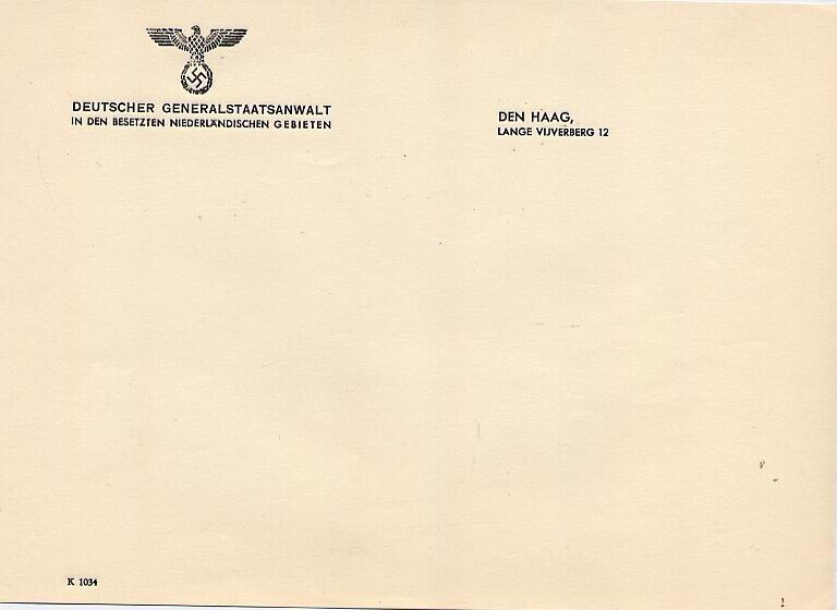 Twee vellen blanco Duits briefpapier van de Deutscher Generalstaatsanwalt, voorzien van Duitse rijksadelaar met hakenkruis.