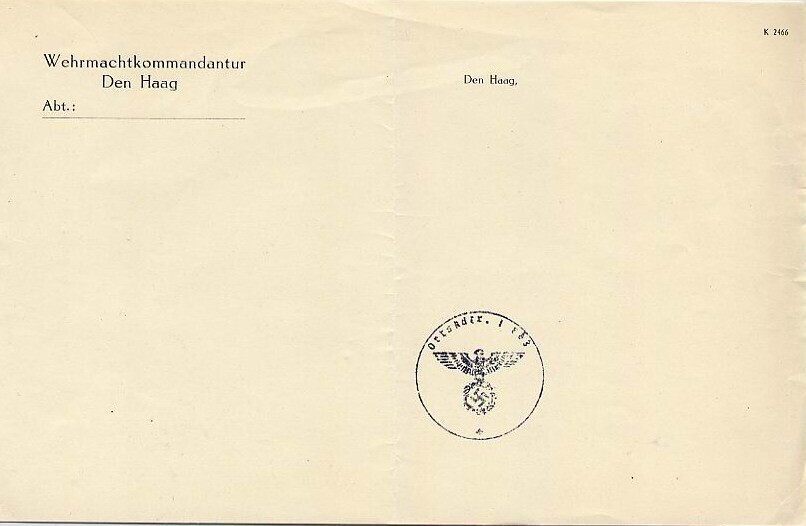 Twee vellen Duits briefpapier A5 formaat, voorzien van een stempel met de Duitse rijksadelaar met hakenkruis. Een exemplaar iets kleiner dan de ander en is met een stempel ondertekend.