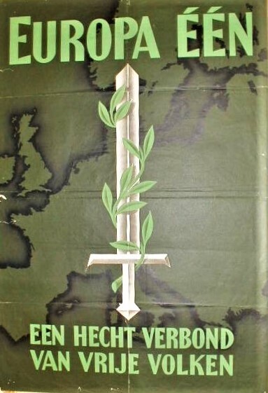 Nationaalsocialistische affiche met groene en witte opdruk waarmee een beroep wordt gedaan op de solidariteit tussen de Europese volken (no.130). Afgebeeld is een met een rank omwonden ontbloot zwaard met op de achtergrond de kaart van Europa.