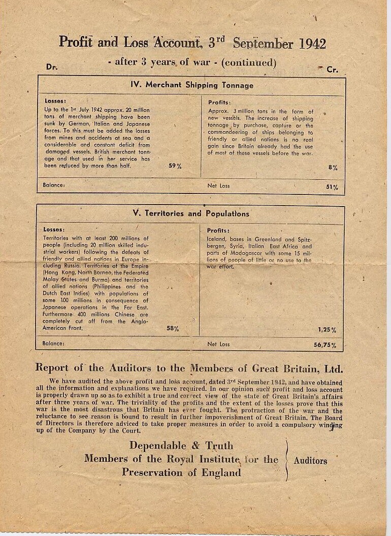 Een in het Engels gesteld pamflet met een anti-Brits overzicht van winst en verlies na drie jaar oorlog door 'Great Britain Ltd.' met de bedoeling de Britse bevolking te demoraliseren.