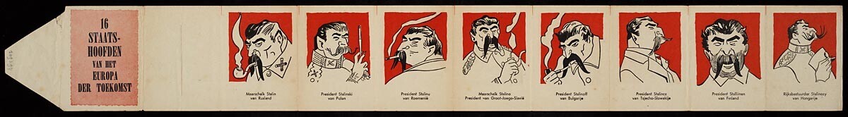 Serie spotprenten van Stalin als staatshoofd van 16 landen van Europa. Alleen in Nederland zou Wilhelmina koningin blijven "Want daar blijft alles bij het oude zeggen ze...." Opgevouwen set is te sluiten als een enveloppe. Op de voorkant: "Voorzichtig openen".
