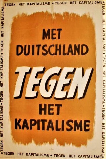 Een affiche van nationaalsocialistische signatuur met bruine, witte en zwarte opdruk waarmee opgeroepen wordt om samen met Duitsland het kapitalisme te bestrijden.