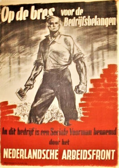 Een affiche met rode en zwarte opdruk van het Nederlandsche Arbeidsfront (no.60) met de afbeelding van een man met een hamer achter een kapotte muur met achter hem een groep mensen. Onder hem de tekst: "In dit bedrijf is een Sociale Voorman benoemd door het Nederlandsche Arbeidsfront".