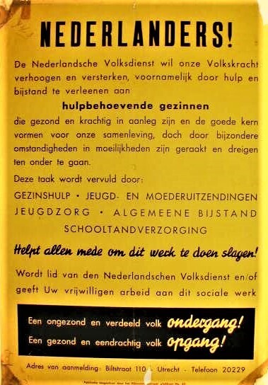 Affiche van de Nederlandsche Volksdienst (no.65) waarin opgeroepen wordt om lid te worden in verband met de steun aan hulpbehoevende gezinnen.
