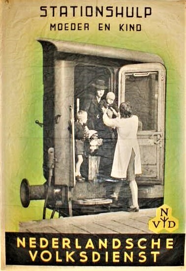 Een affiche met zwarte, blauwe en gele opdruk van de Nederlandsche Volksdienst (no. 43) waarmee reclame wordt gemaakt voor de activiteiten van deze organisatie op het gebied van hulp aan treinreizigers. Afgebeeld is een vrouw die helpt om een kind van en oudere vrouw uit de trein te tillen terwijl een jongentje toekijkt.