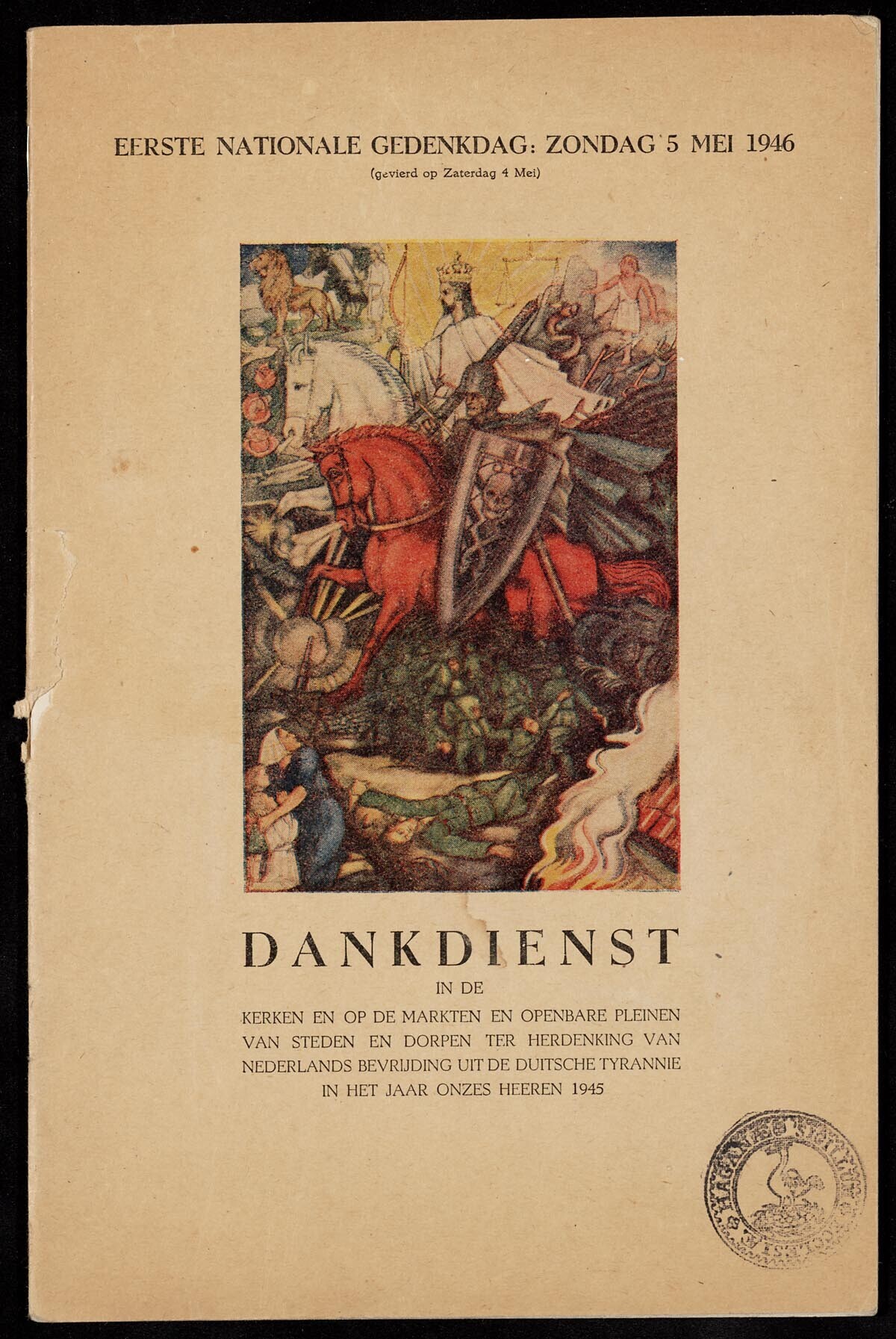 Boekje met de gesproken inhoud en liedteksten voor de "Dankdienst in de kerken en op de markten en openbare pleinen van steden en dorpen ter herdenking van Nederlands bevrijding uit de Duitsche tyrannie in het jaar onzes Heeren 1945" ter gelegenheid van de "Eerste nationale gedenkdag: Zondag 5 Mei 1946 (gevierd op Zaterdag 4 Mei)". Op de kaft is aan de voorkant in kleurendruk een allegorische prent afgebeeld van oorlog en bevrijding in Middeleeuwse stijl. Op de achterkant is in kleurendruk een allegorische prent afgebeeld van de door oorlog geteisterde 'Tuin van Holland' met klimmende Nederlandse Leeuw en de tekst "Luctor et Emergo". Het boekje is "Uitgegeven voor de Stichting tot verbreiding van het geestelijk lied door A. Jongbloed, Leeuwarden".