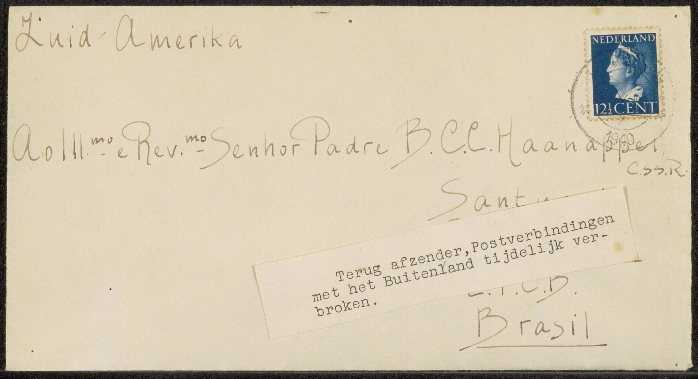 Handgeschreven brief van 9 mei 1940 van P.A.M. Haanappel te Bloemendaal aan Ber Haanappel in Brazilië. Op de enveloppe is een poststikker geplakt met de mededeling "Terug afzender, Postverbindingen met het Buitenland tijdelijk verbroken."